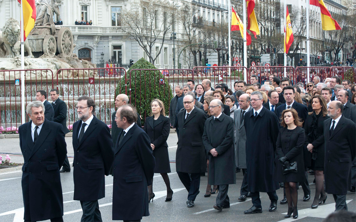 Las máximas autoridades, encabezadas por Mariano Rajoy, acompañaron el féretro de Adolfo Suárez en la Plaza de Cibeles.