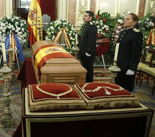 El lunes el primer presidente de la democracia fallecido el domingo ha recibido de manos del Rey el collar de la Real Orden de Carlos III, quien lo depositó sobre el ataud durante la capilla ardiente.