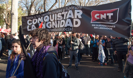 Anarquistas confesos, los miembros de la Confederación Nacional del Trabajo (CNT) han estado muy presentes en las marchas del 22M, tanto en su organización como en su difusión. Capitaneados por su secretario general, Pedro Serna, la CNT acudió el sábado a Madrid contra los recortes y " los gobiernos de la Troika ".