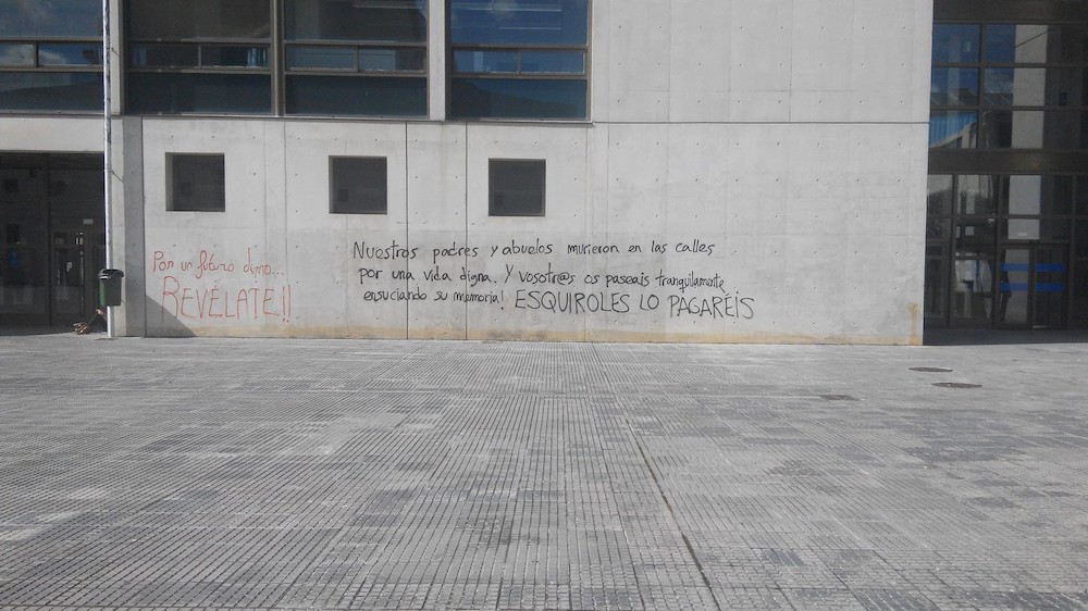 Entre los que llamaban a participar en las protestas con pintadas en la universidad se ha colado un llamativo error ortográfico: "Por un futuro digno... revélate". El autor, posiblemente un estudiante, confundió el verbo "rebelarse" con "revelar". Al lado, otra pintada amenazaba a los estudiantes que sí querían ir a clase: "Esquiroles, lo pagaréis".