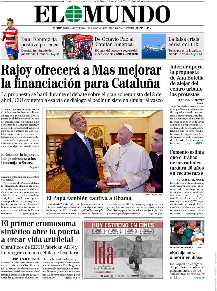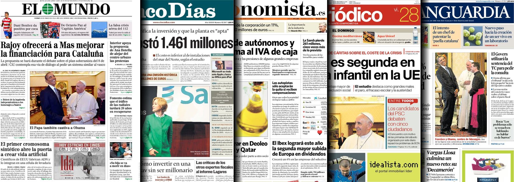 Portadas de los diarios El Mundo, El País, ABC, La Razón, La Vanguardia, El Periódico, Cinco Días, El Economista, Expansión, Marca, As, Mundo Deportivo y Sport.
