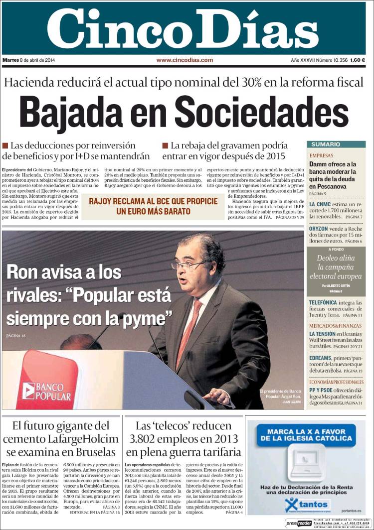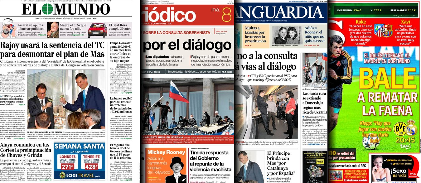 Portadas de los diarios El Mundo, El País, ABC, La Razón, La Vanguardia, El Periódico, Cinco Días, El Economista, Expansión, Marca, As, Mundo Deportivo y Sport.