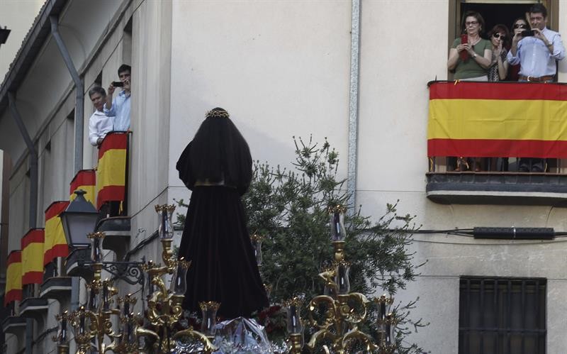 Varias personas observan desde los balcones la talla de Jesús Nazareno "El Pobre" tras su salida de la Iglesia de San Pedro "El Viejo" en Madrid