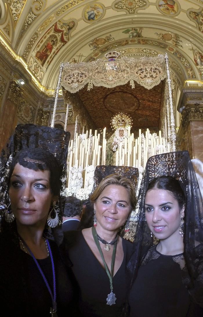 Varias mujeres vestidas de mantilla visitan la Basílica de Santa María de la Esperanza Macarena antes de salir en procesión