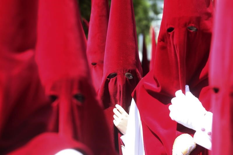 Unos nazarenos de la Cofradía de la Sagrada Cena, durante su estación de penitencia