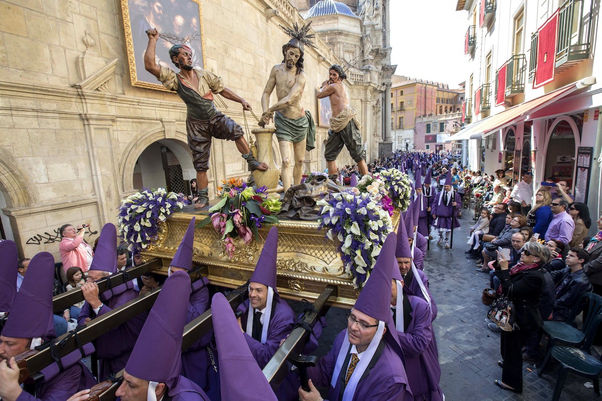 Paso "Los azotes", del escultor Francisco Salzillo y Alcaraz, de 1777 , perteneciente a la cofradía Nuestro Padre Jesús Nazareno de Murcia, durante la procesión que este Viernes Santo ha recorrido las calles de Murcia.