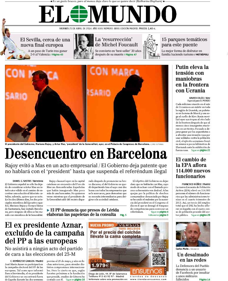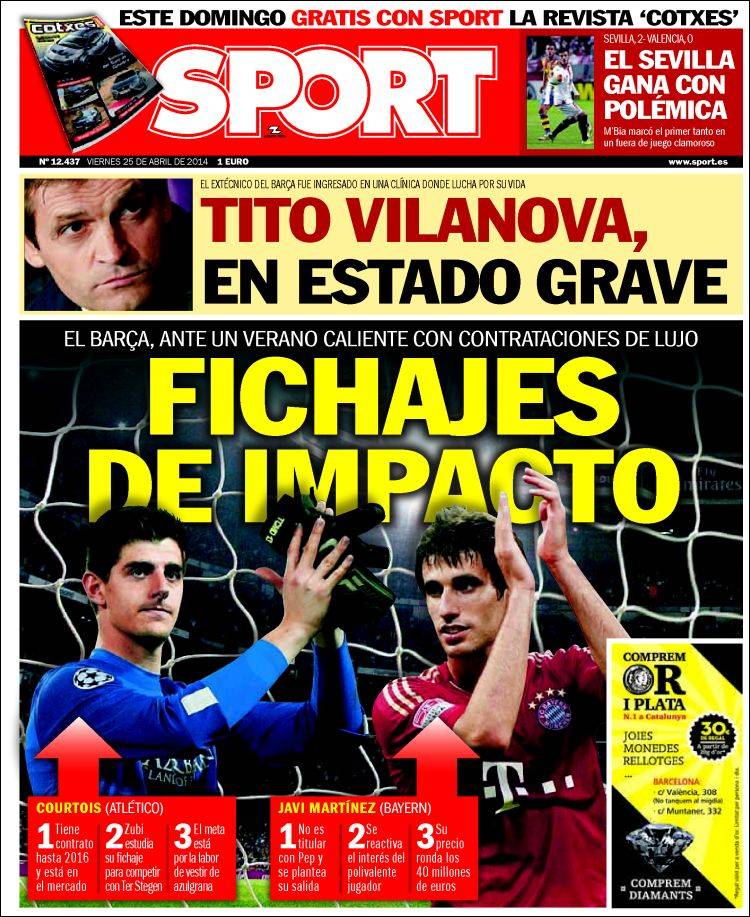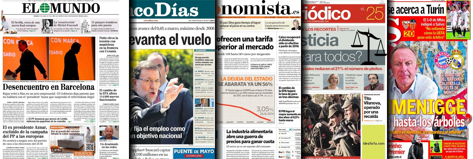 Portadas de los diarios El Mundo, El País, ABC, La Razón, La Vanguardia, El Periódico, Cinco Días, El Economista, Expansión, Marca, As, Mundo Deportivo y Sport.