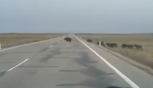 En un vídeo subido a internet el pasado 4 de abril, puede verse cómo dos conductores deben detener sus vehículos ante una manada de jabalíes que cruza a toda velocidad la calzada.