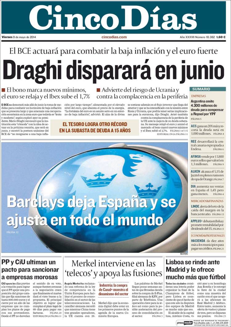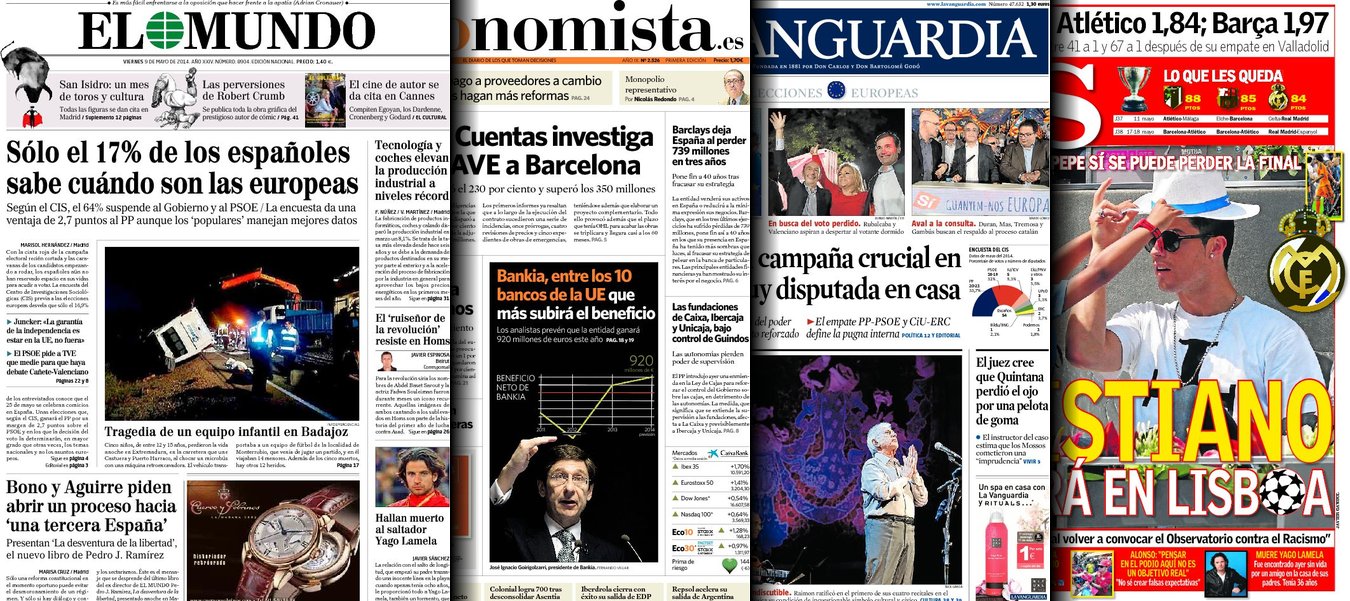 Portadas de los diarios El Mundo, El País, ABC, La Razón, La Vanguardia, El Periódico, Cinco Días, El Economista, Expansión, Marca, As y Sport.