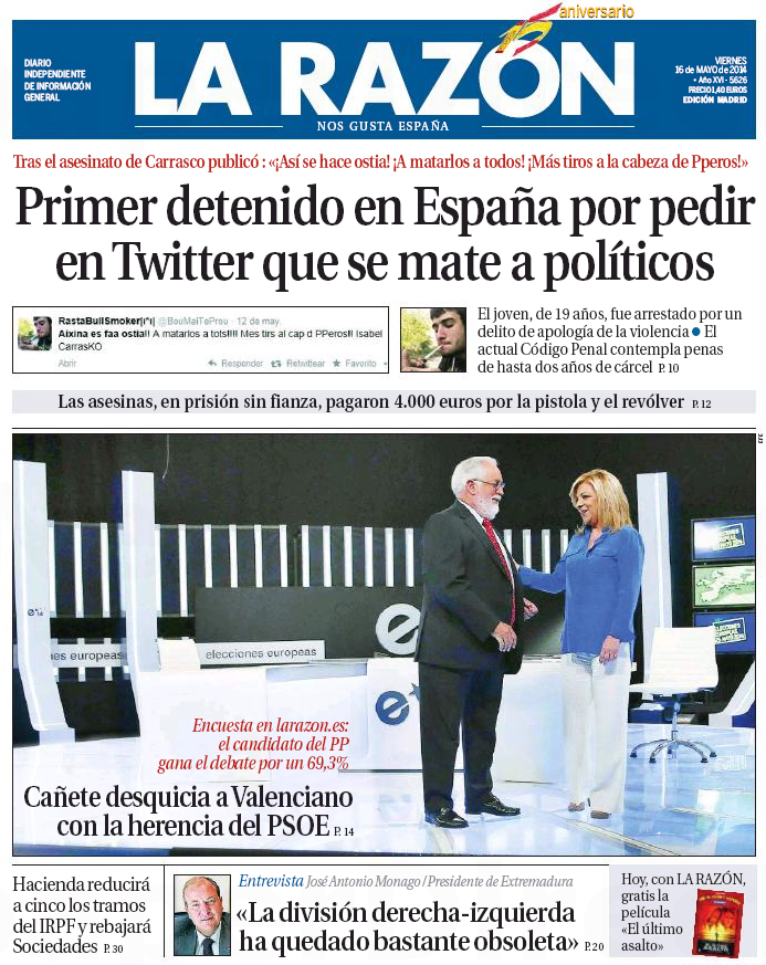 "Primer detenido en España por pedir en Twitter que se mate políticos"