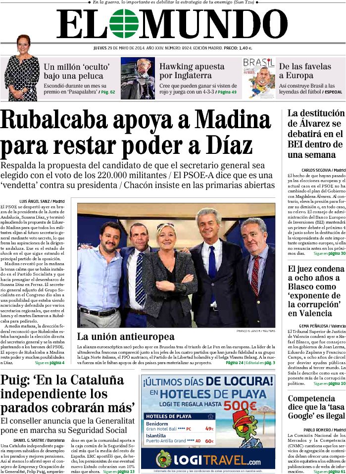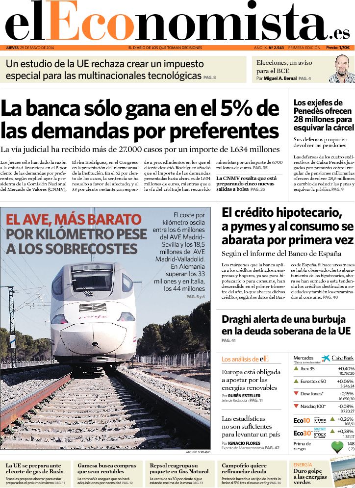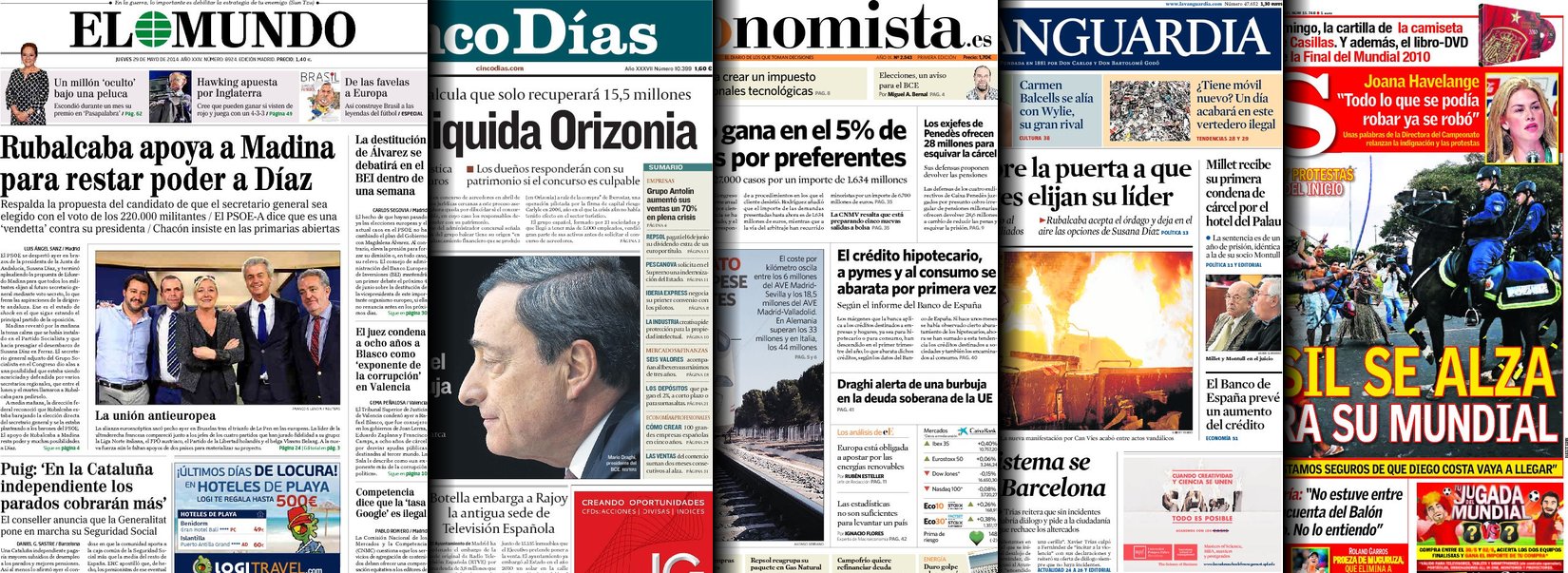 Portadas de los diarios El Mundo, El País, ABC, La Razón, La Vanguardia, El Periódico, Cinco Días, El Economista, Expansión, Marca, As, Mundo Deportivo y Sport.