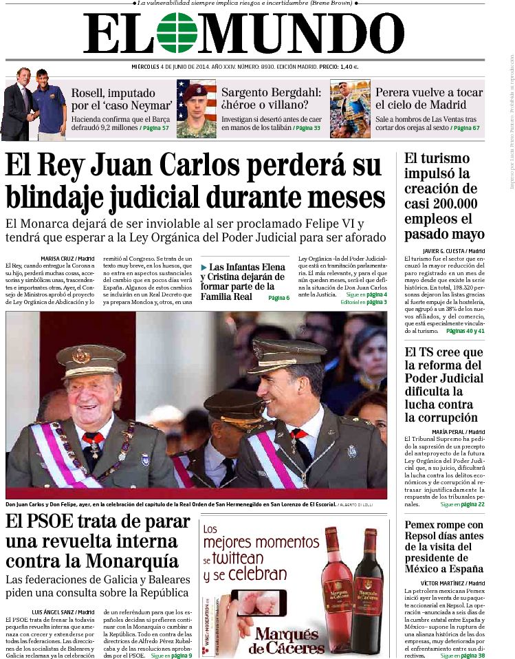 "El Rey Juan Carlos perderá su blindaje judicial durante meses"