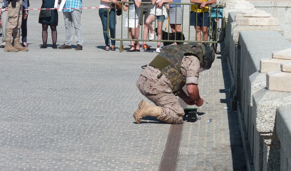 El EOD colocando las cargas eléctricas que detonará más tarde el robot.