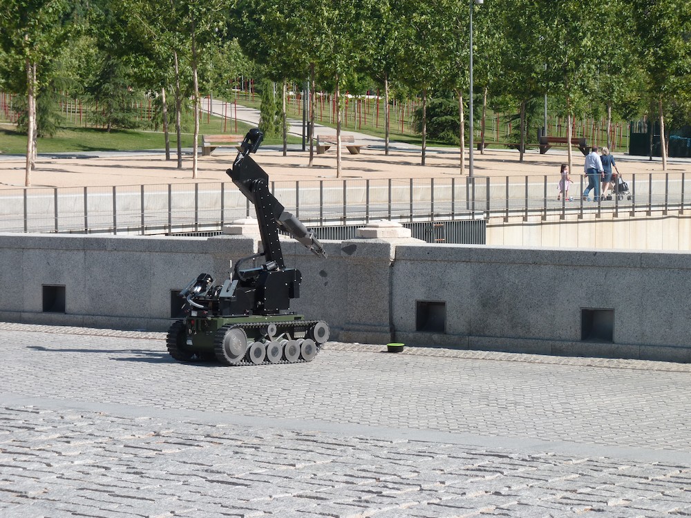 El robot del Equipo de Desactivación del Jefe del Estado Mayor del Ejército de Tierra apunto de disparar los cartuchos de agua.