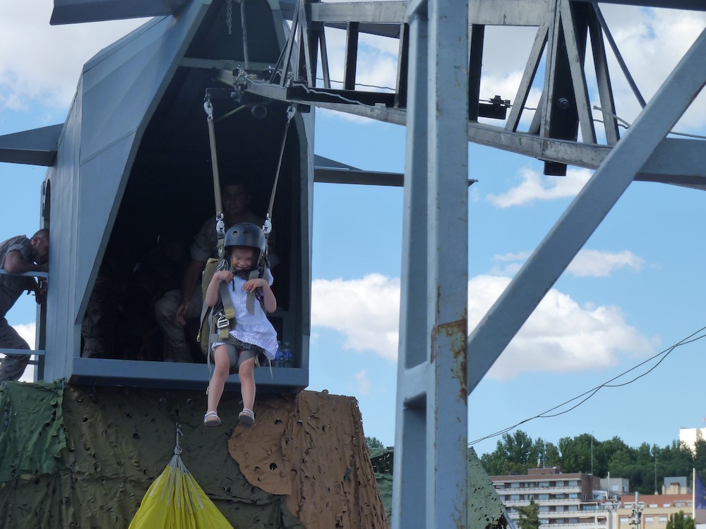 Si su hijo sueña con ser paracaidista, debe probar la tirolina montada por la BRIPAC en Madrid Río.