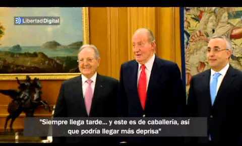 En una de sus últimas actividades públicas antes de su abdicación, el Monarca, de muy buen humor, ha bromeado con sus invitados y con los periodistas presentes y, así, cuando un ayudante de campo se ha acercado a recoger el bastón que le tendía, para posar sin él ante las cámaras, ha comentado, sonriente: "Siempre llega tarde; este es de caballería, pero podría llegar más deprisa".