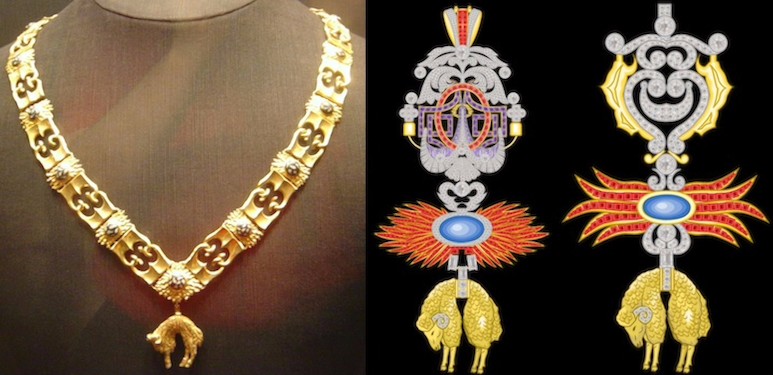 Tanto Don Juan Carlos como Don Felipe son miembros de la oden de caballería del Toisón de Oro. A la izquierda, el collar que llevan los miembros de la orden. En el centro, el colgante del Gran Maestre (Don Juan Carlos). A la izquierda, el de uno de sus miembros (Don Felipe).