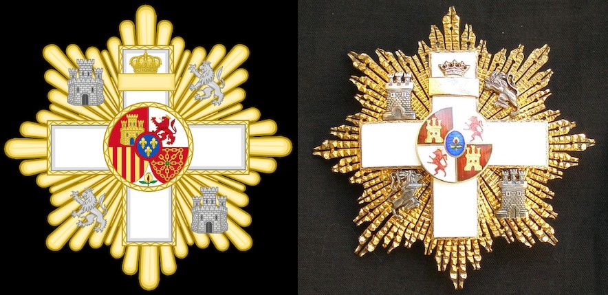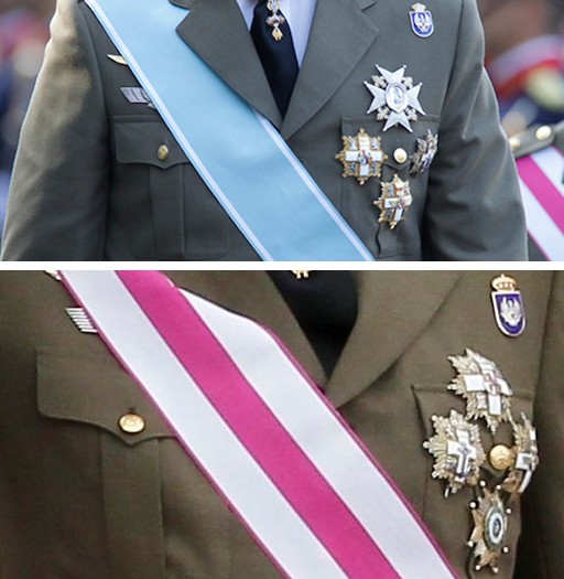 Tanto Don Juan Carlos como Don Felipe portan en su uniforme las mayores condecoraciones: las cruces del mérito militar, naval y aeronaútico y la Cruz de Carlos III, tanto en su versión esmaltada como de plata y piedras.