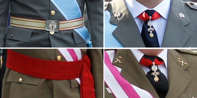 A la izquierda, en la parte de arriba, el ceñidor que llevan todos los militares en su uniforme de etiqueta del Ejército de Tierra, salvo aquellos que son generales. Abajo, la faja de seda roja de general. A la derecha, arriba, la parte superior de la guerrera de Don Felipe con el emblema de la Infantería y el colgante de caballero del Toisón de Oro. Abajo, la parte superior de la guerrera de Don Juan Carlos con el emblema de general y el colgante de Gran Maeste del Toisón de Oro. En la foto vertical central, la bocamanga con el entorchado de general y la divisa de capitán general. En la vertical derecha, la bocamanga actual del Príncipe, con las dos estrellas de ocho puntas de teniente coronel.