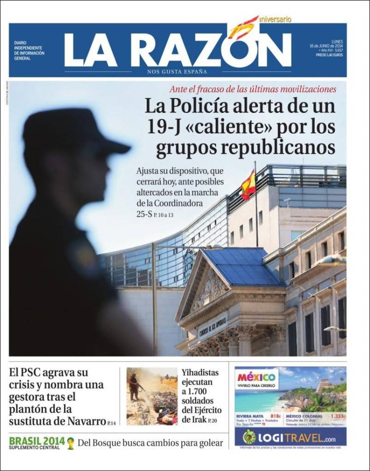 "La Policía alerta de un 19-J 'caliente' por los grupos republicanos"