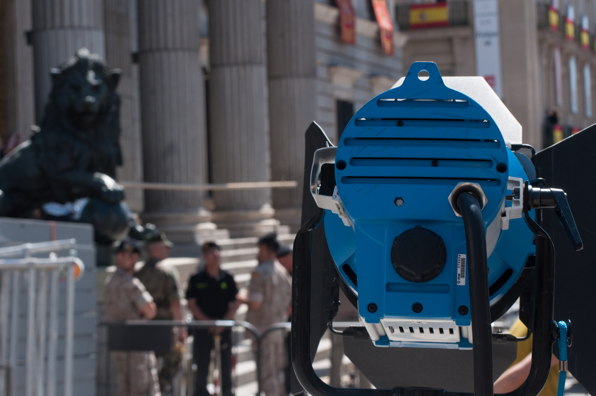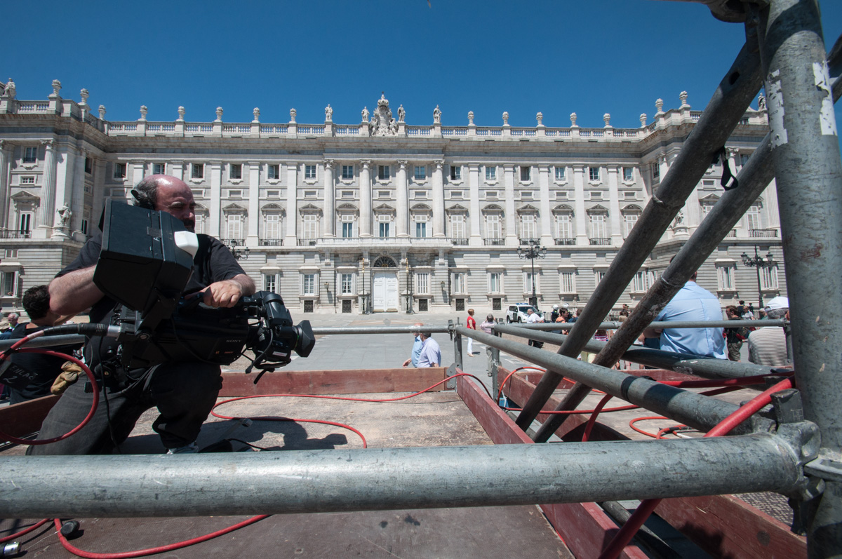 Un técnico de televisión coloca su equipo en una de las gradas ante el Palacio Real.