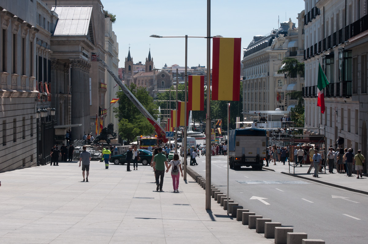 Una primera vista de la bajada de la Carrera de San Jerónimo dejaba ver el colorido de las banderas de España colocadas en la farolas.