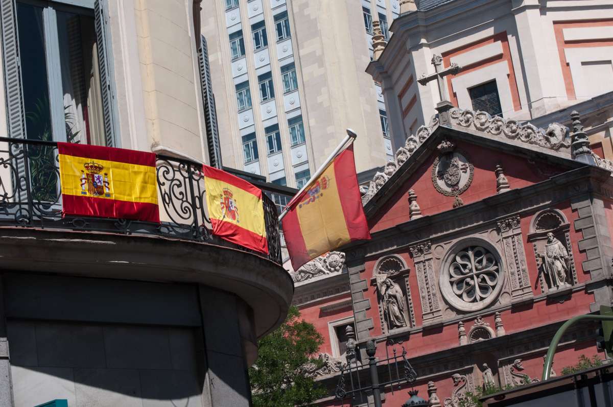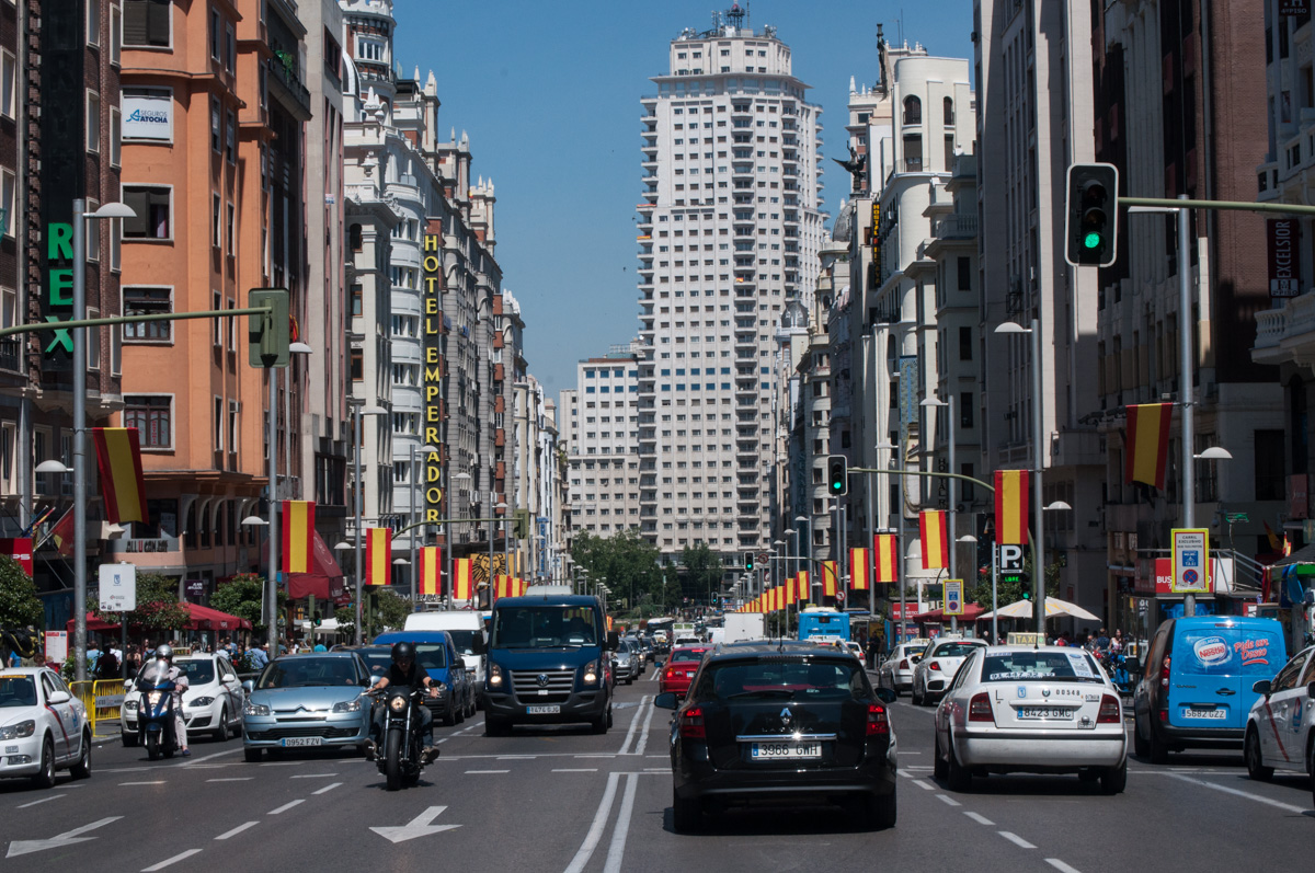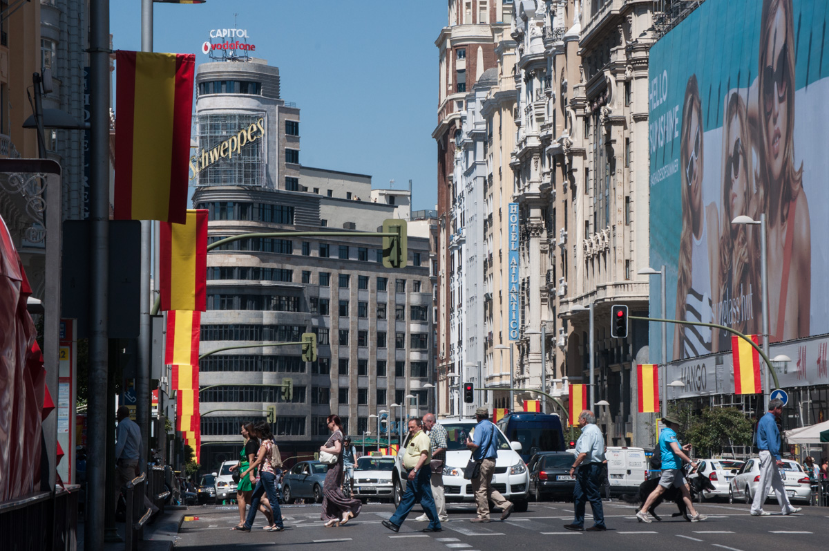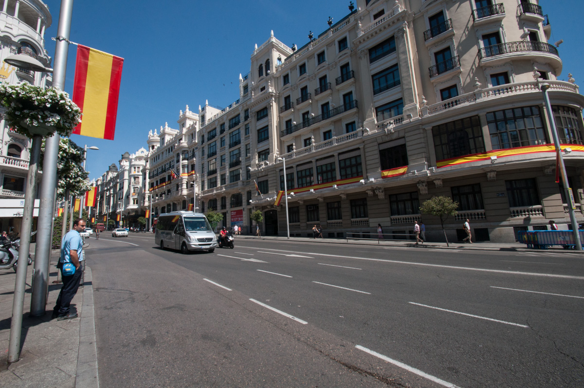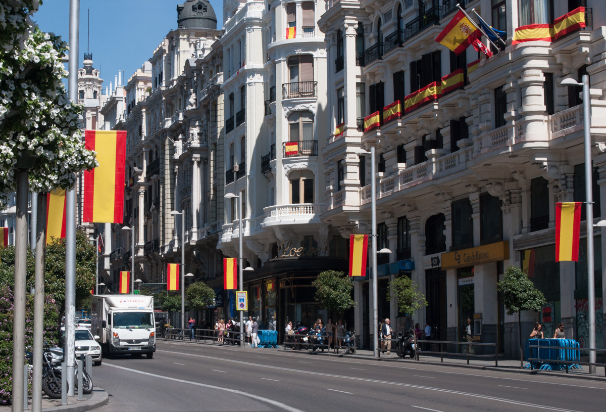 Otra vista de la Calle Gran Vía con decenas de banderas de España.