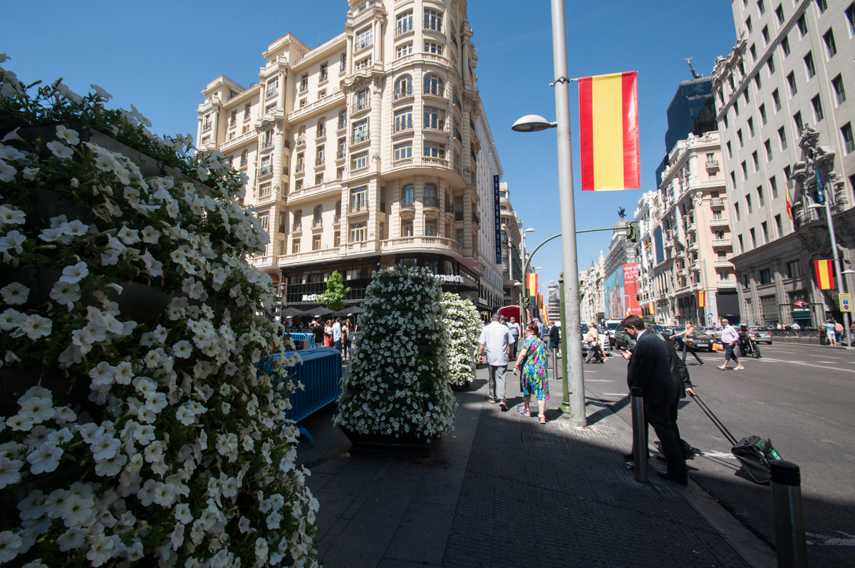 Continuando en la calle Gran Vía, a la altura de la calle Montera. Los adornos florales embellecerán, aún más si cabe, el recorrido real.