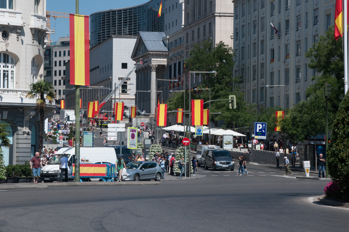 El centro de la capital de España se prepara para el recorrido que realizará el Rey Felipe VI, en coche, por las calles más emblemáticas de la ciudad.