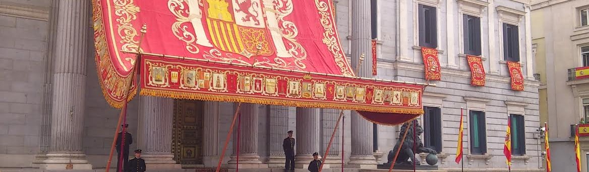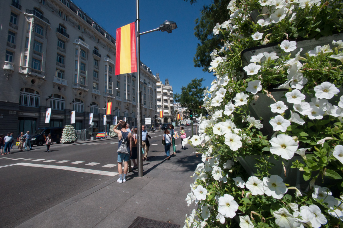 Ya en la entrada a la Plaza de las Cortes las flores y las bandera están colocadas estratégicamente para engalanar aún más el recorrido.