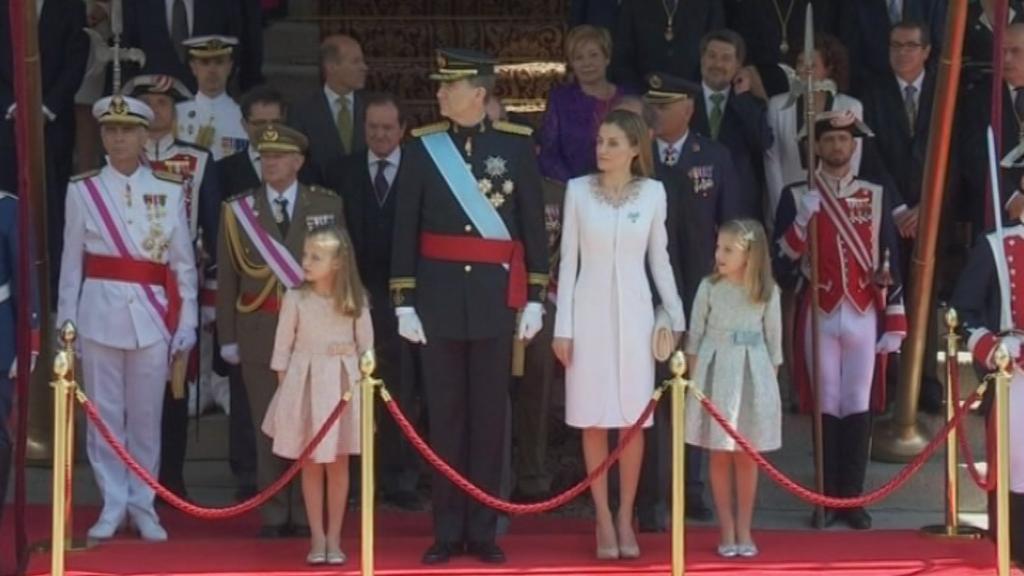 Los reyes y sus hijas han salido a las puertas del Congreso de los Diputados para presidir la parada militar, entre gritos de ¡Felipe, Felipe! de las personas congregadas en los alrededores.