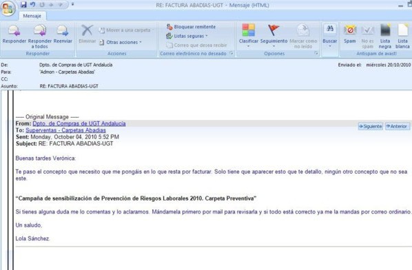En este sentido, las mismas fuentes consultadas han precisado que los agentes del Grupo de Delincuencia Económica de la UCO que participan en la operación se encuentran en estos momentos realizando un registro -el séptimo que se realiza ya dentro de esta investigación- en la empresa Carpetas Abadía de la localidad alicantina de Agost, donde han detenido a dos representantes de la sociedad por su presunta relación con el caso de las facturas falsas del sindicato UGT-A. Inicialmente, la Guardia Civil imputa a los detenidos un delito de fraude en subvenciones. En el siguiente correo se explica, sobradamente, la acción de la Guardia Civil: