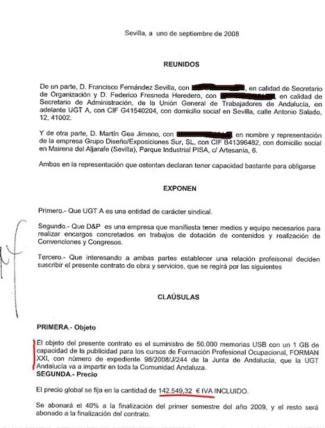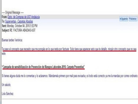 Era lo que se desprendía de muchos de los documentos en poder de Libertad Digital, pero ahora ha sido confirmado por los empresarios detenidos ayer en el marco de la Operación Cirene II de la Guardia Civil. Las facturas falsas detectadas en la contabilidad de UGT eran realizadas por los responsables de las empresas proveedoras siguiendo las órdenes del propio sindicato que, presuntamente, ejercía una fuerte presión sobre sus proveedores. Vean un ejemplo:
