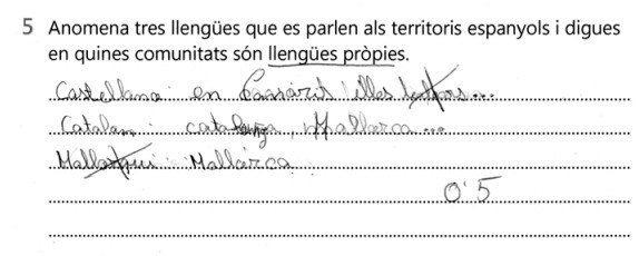 Una de las pruebas presentadas ante el Ejecutivo que preside José Ramón Bauzá es uno de los exámenes realizados por el alumno de 10 años. En el punto cinco se pedía a los alumnos que nombraran tres lenguas que se hablen en los territorios españoles y que dijeran en qué comunidades son lengua propia. Las respuestas del hijo de Juan Miguel fueron: