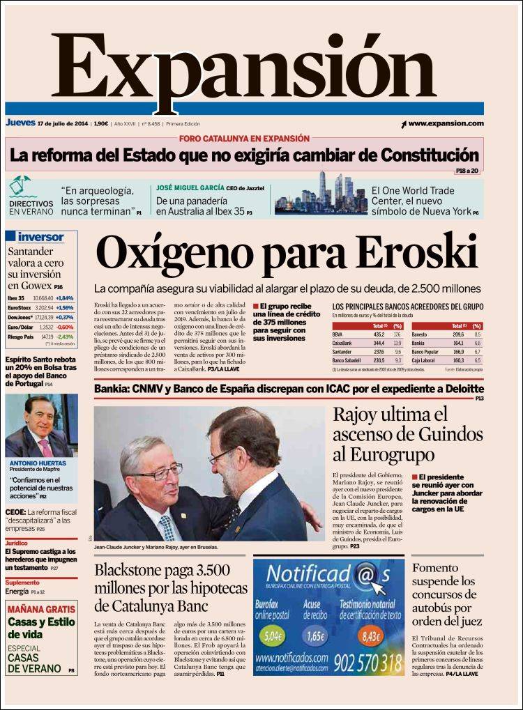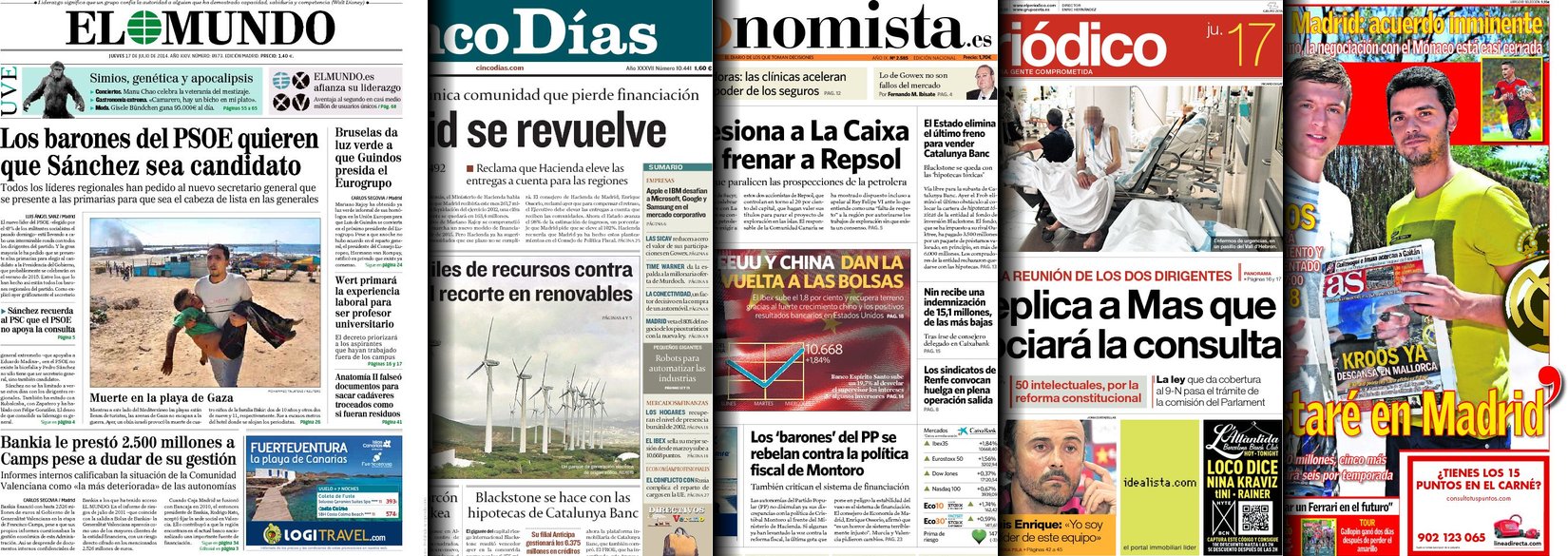 Portadas de los diarios El Mundo, El País, ABC, La Razón, La Vanguardia, El Periódico, Cinco Días, El Economista, Expansión, As, Mundo Deportivo y Sport.