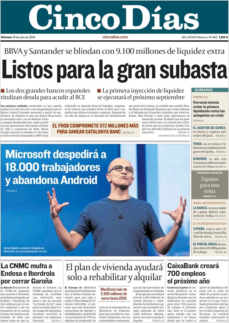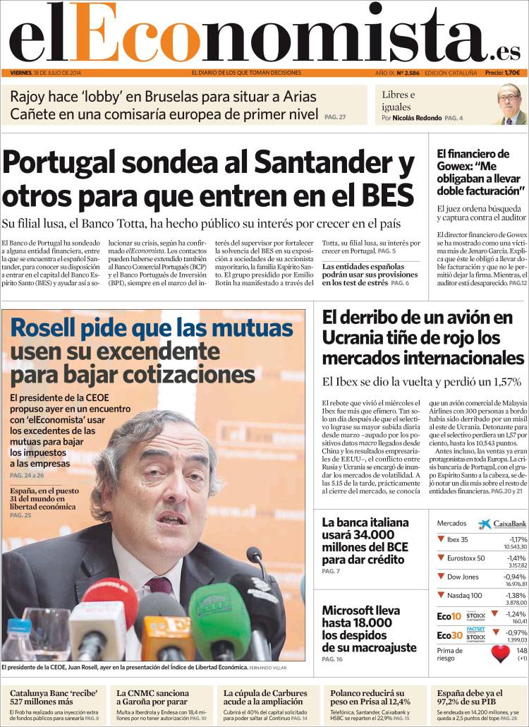 Portadas de los diarios El Mundo, El País, ABC, La Razón, La Vanguardia, El Periódico, Cinco Días, El Economista, Expansión, Marca, As, Mundo Deportivo y Sport.