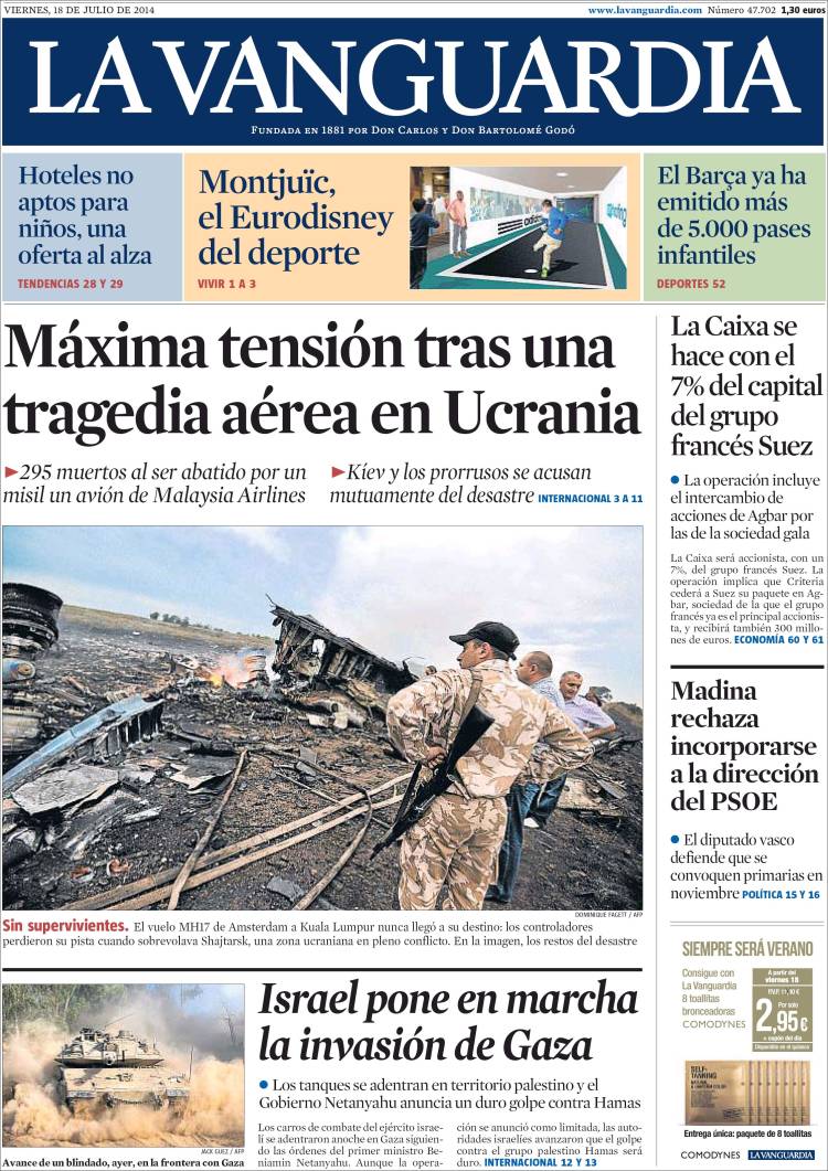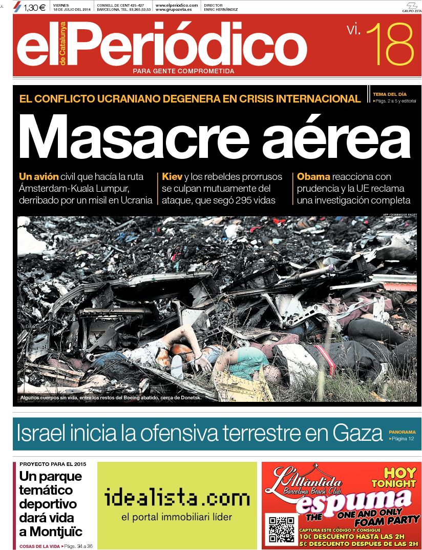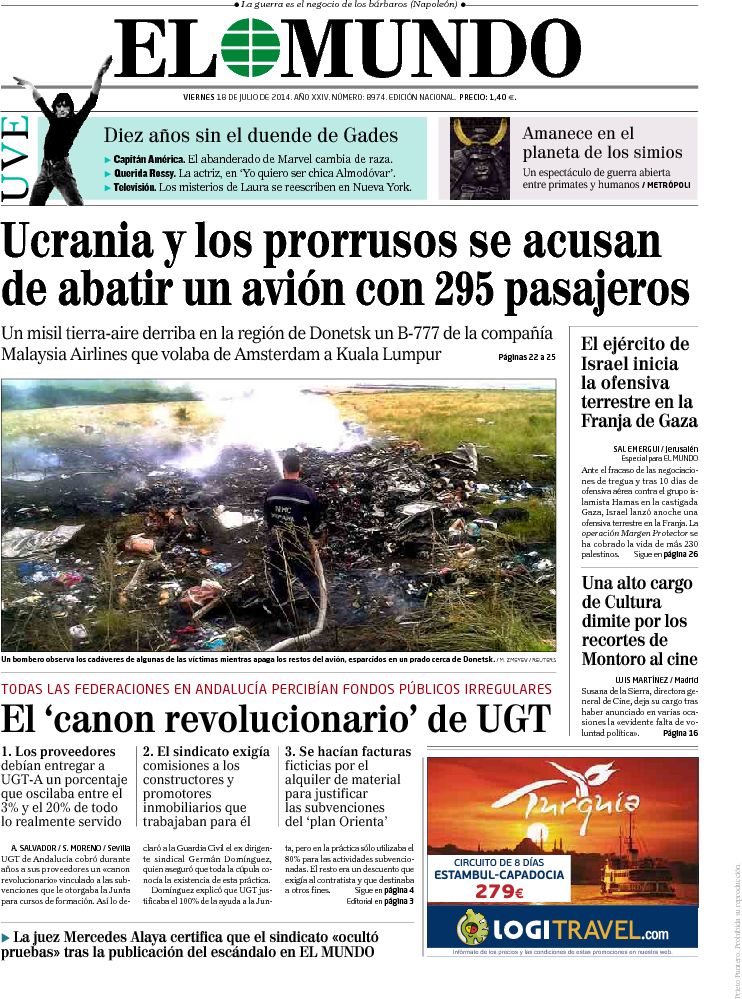 "Un misil derriba un avión con 295 pasajeros en Ucrania"