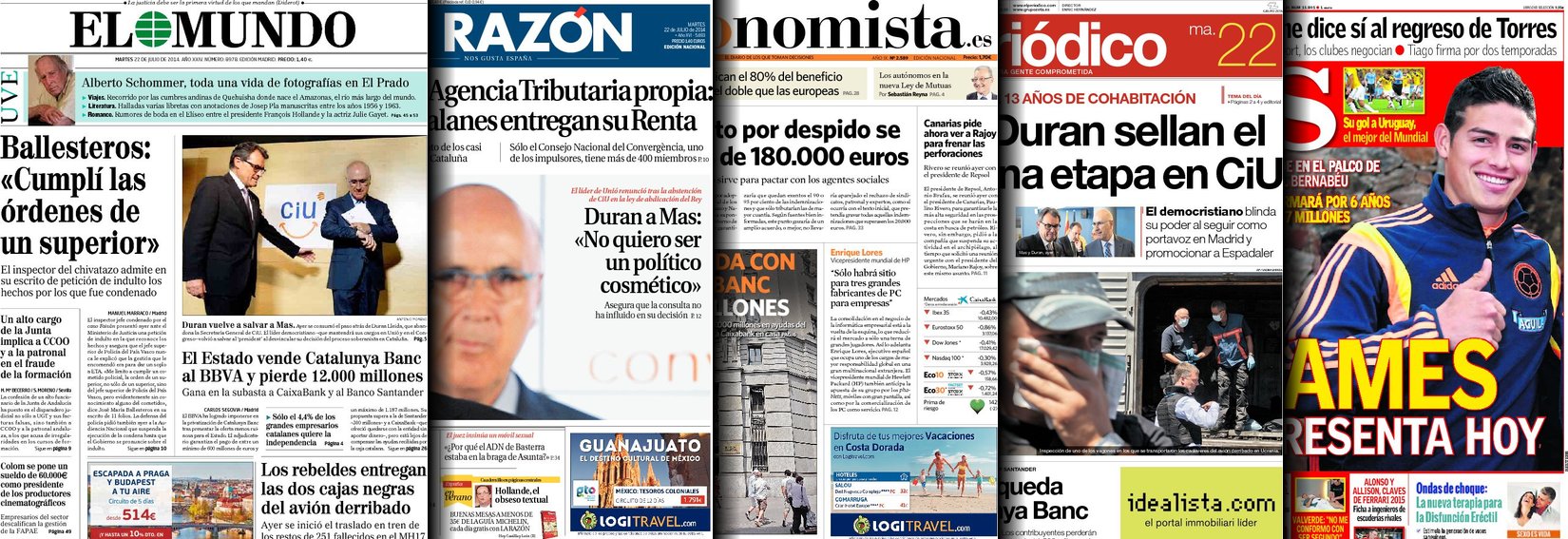 Portadas de los diarios El Mundo, El País, ABC, La Razón, La Vanguardia, El Periódico, Cinco Días, El Economista, Expansión, Marca, As, Mundo Deportivo y Sport.