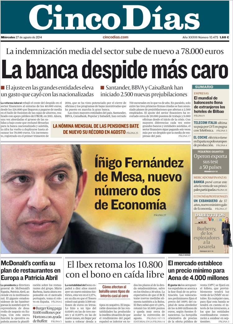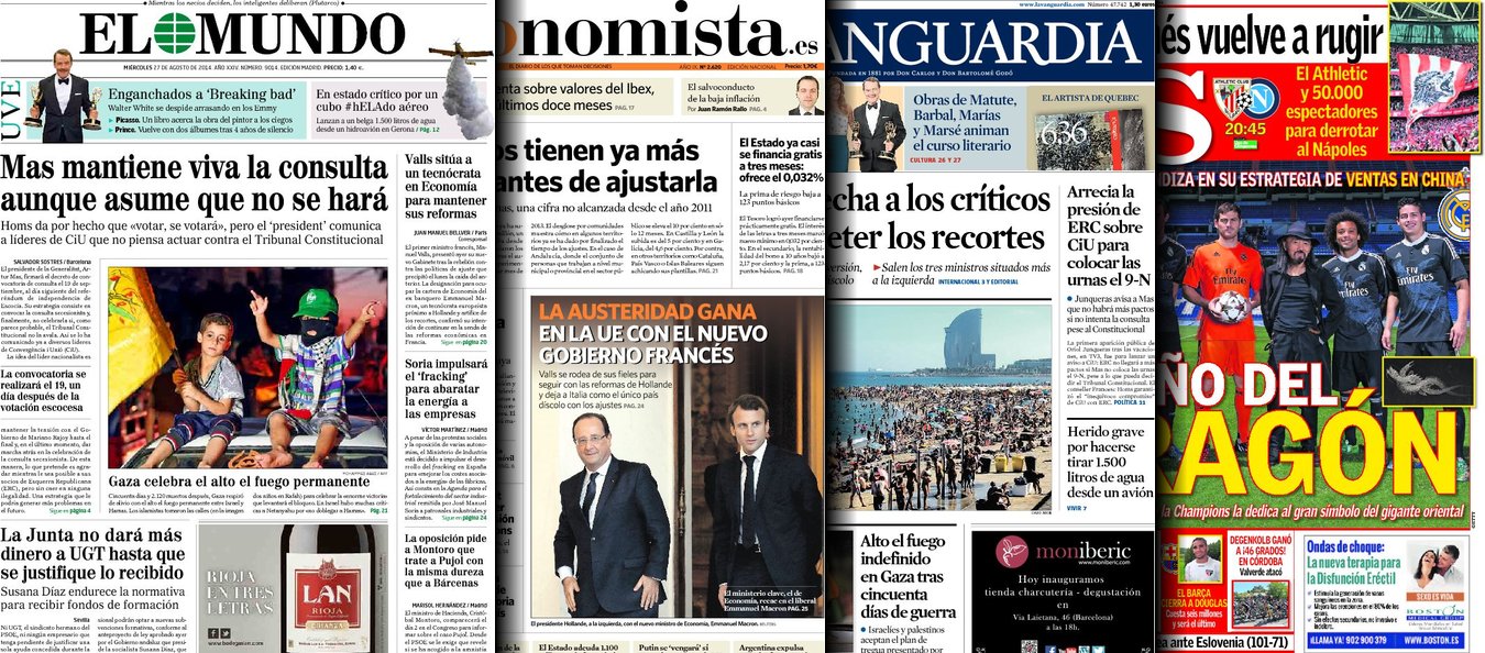 Portadas de los diarios El Mundo, El País, ABC, La Razón, La Vanguardia, El Periódico, Cinco Días, El Economista, Expansión, Marca, As, Mundo Deportivo y Sport.