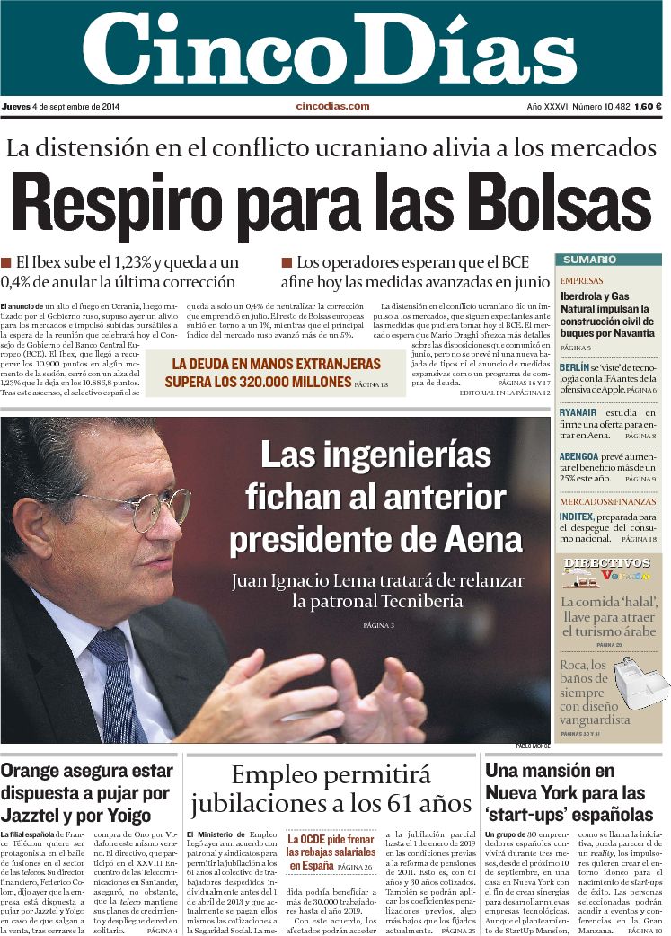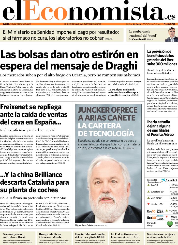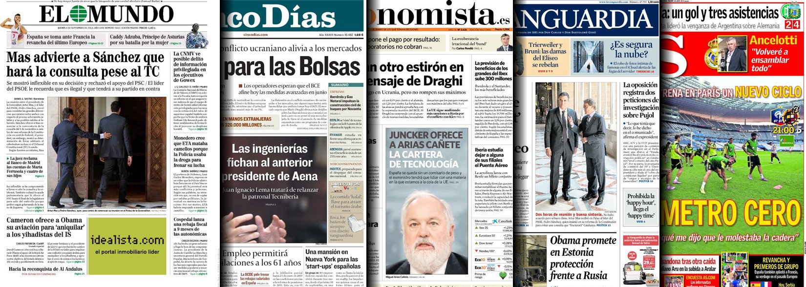 Portadas de los diarios El Mundo, El País, ABC, La Razón, La Vanguardia, El Periódico, Cinco Días, El Economista, Expansión, Marca, As, Mundo Deportivo y Sport.