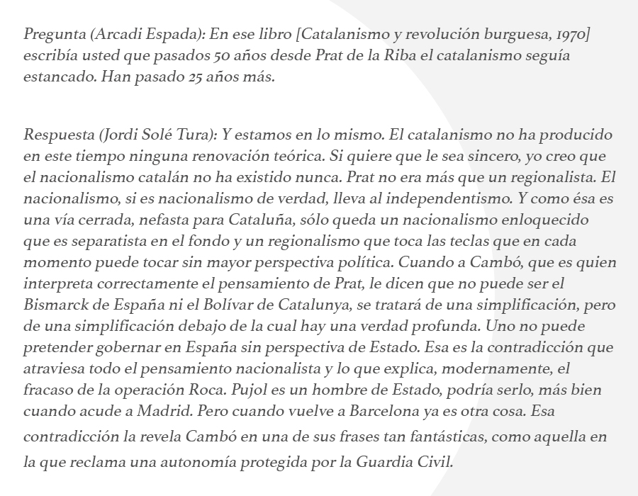 JORDI SOLÉ TURA (Mollet del Vallés, 1930 - Barcelona, 2009; político, coautor de la Constitución de 1978, ministro de Cultura), entrevista con Arcadi Espada, El País, 13 de enero de 1992.