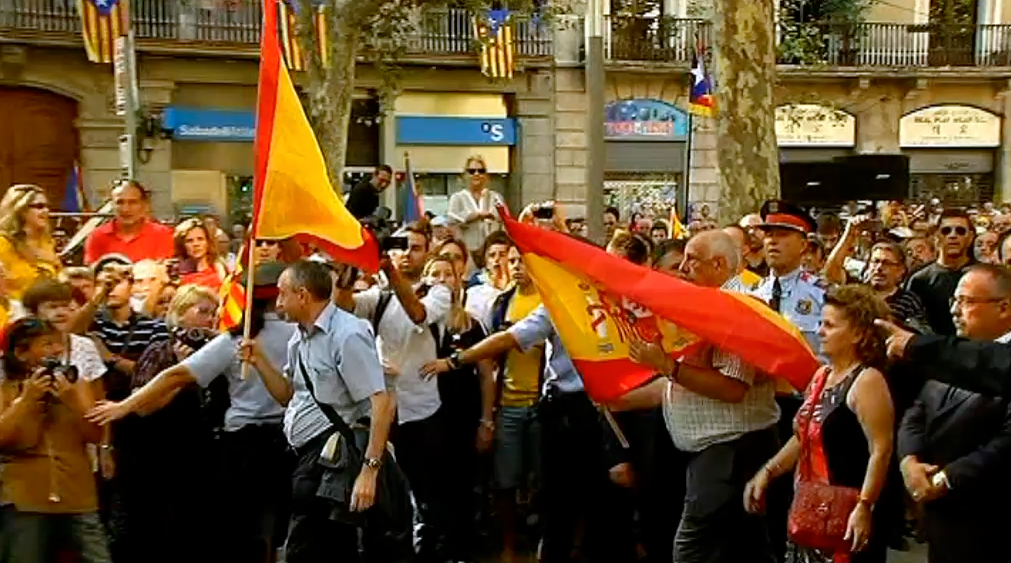 Un grupo de independentistas han pitado y gritado a otro grupo que ha acudido a la tradicional ofrenda floral en el monumento a Rafael Casanova con motivo de la Diada. Uno de ellos ha clavado la bandera de España a los pies del monumento.