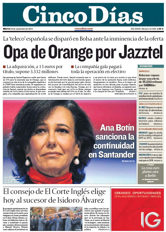 "Orange dará 3.500 millones por Jazztel para alcanzar a Vodafone"