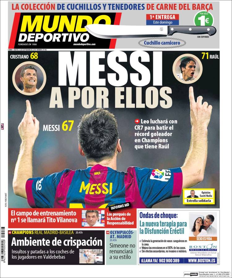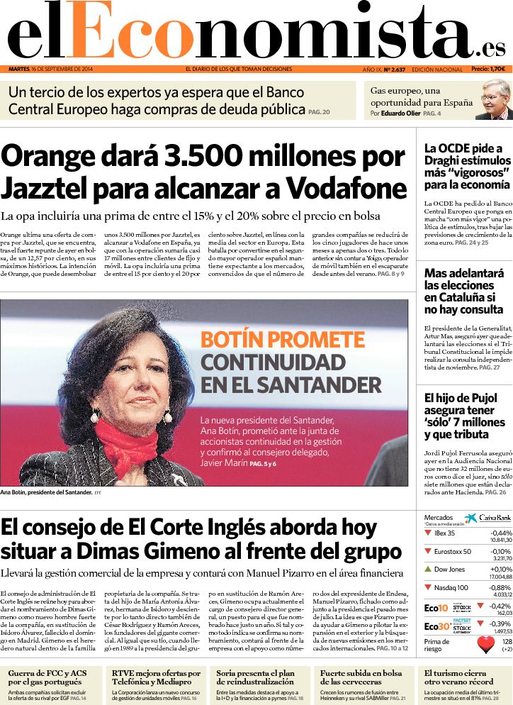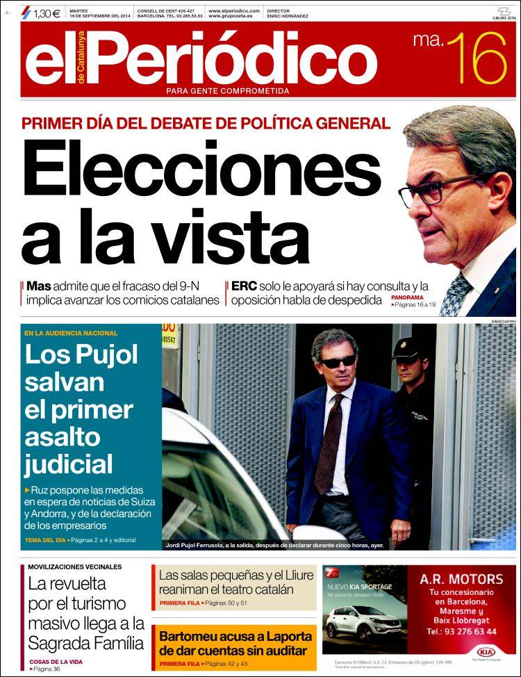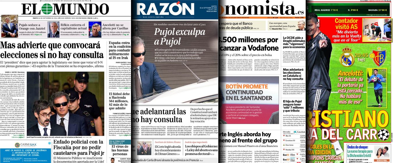 Portadas de los diarios El Mundo, El País, ABC, La Razón, La Vanguardia, El Periódico, Cinco Días, El Economista, Expansión, Marca, As, Mundo Deportivo y Sport.