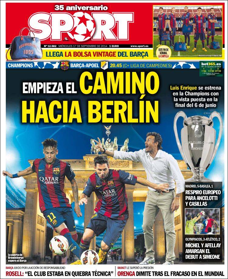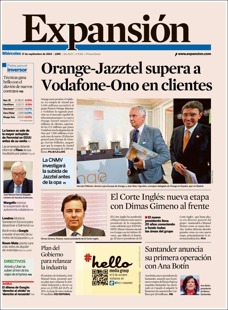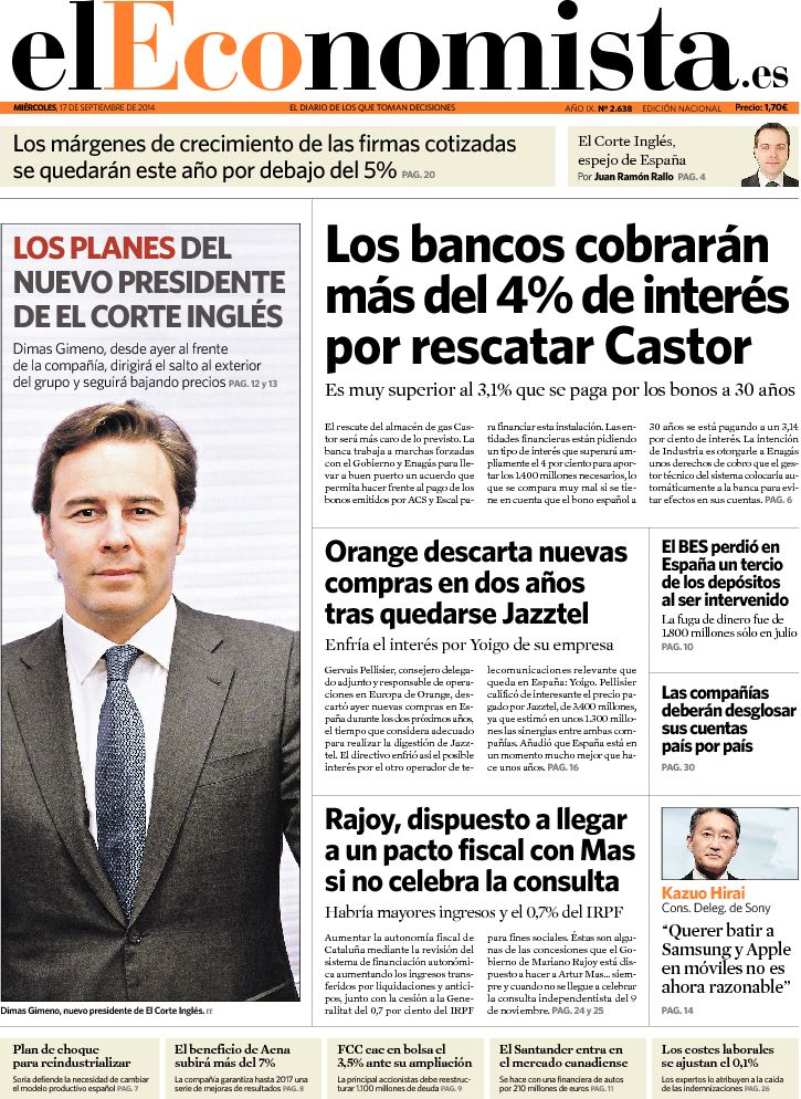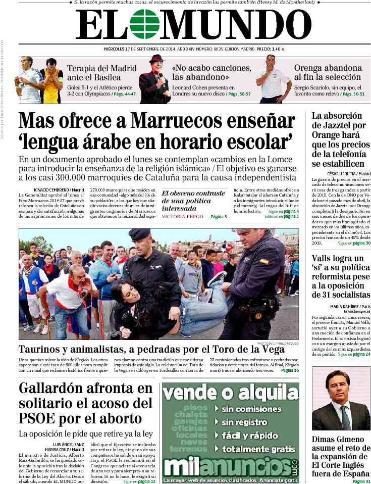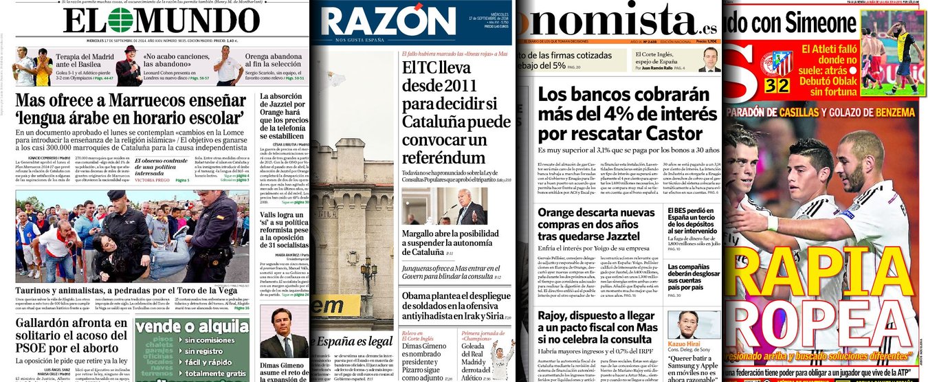 Portadas de los diarios El Mundo, El País, ABC, La Razón, La Vanguardia, El Periódico, Cinco Días, El Economista, Expansión, Marca, As, Mundo Deportivo y Sport.