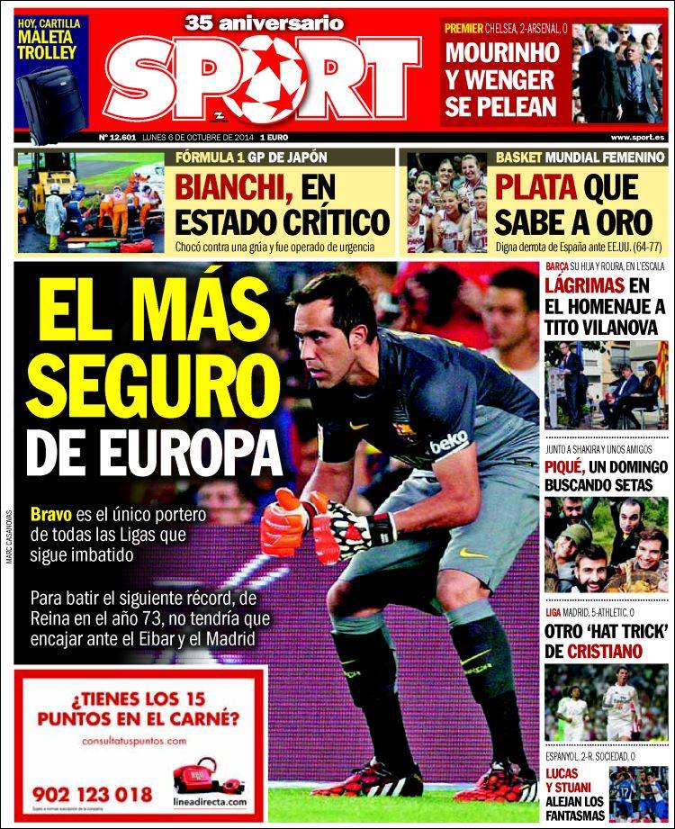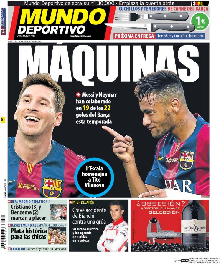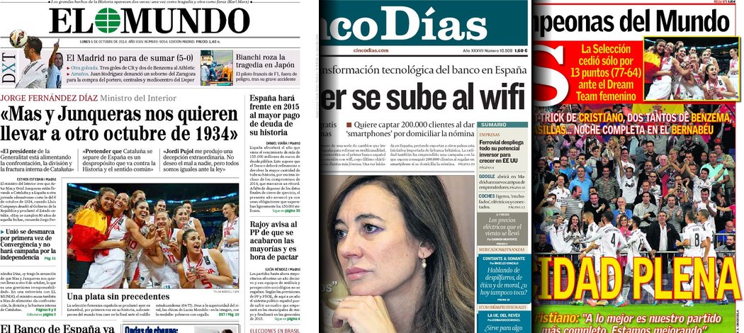 Portadas de los diarios El Mundo, El País, ABC, La Razón, La Vanguardia, El Periódico, Cinco Días, El Economista, Expansión, Marca, As, Mundo Deportivo y Sport.