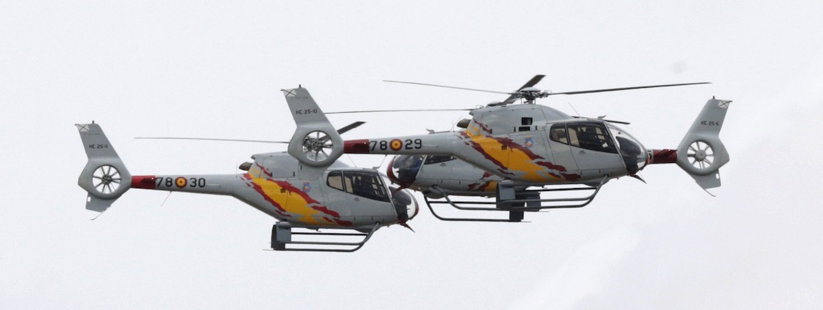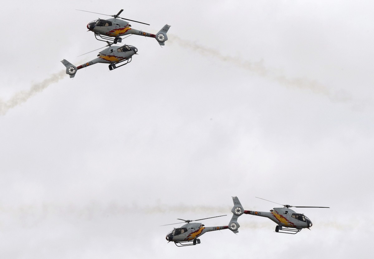 Helicópteros de la Patrulla Aspa (EC-120 Colibrí) durante su exhibición en el 75 aniversario del Ejército del Aire.