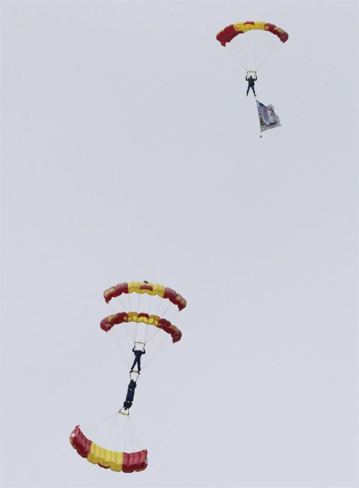 Miembros de la PAPEA (Patrulla Aérea de Paracaidismo del Ejército del Aire) descienden sobre la pista de la base aérea de Torrejón de Ardoz.