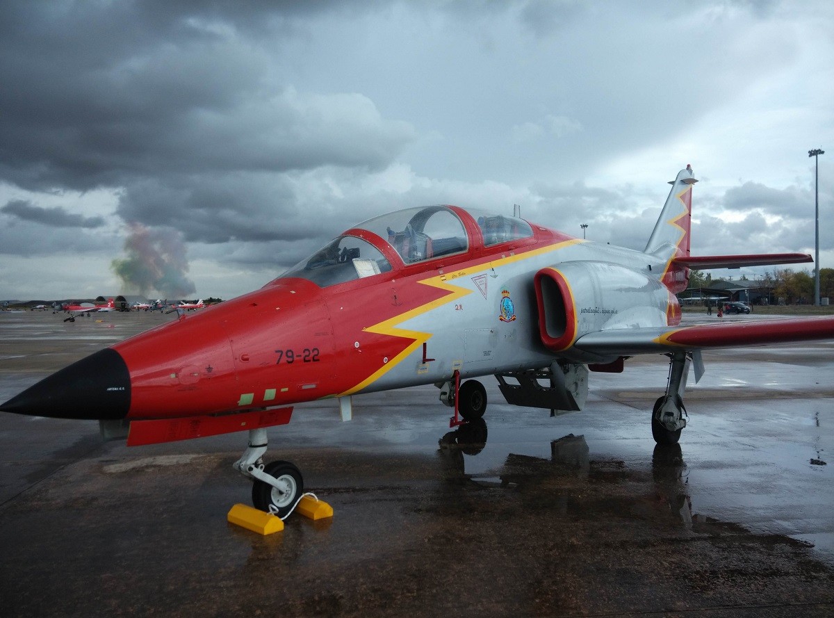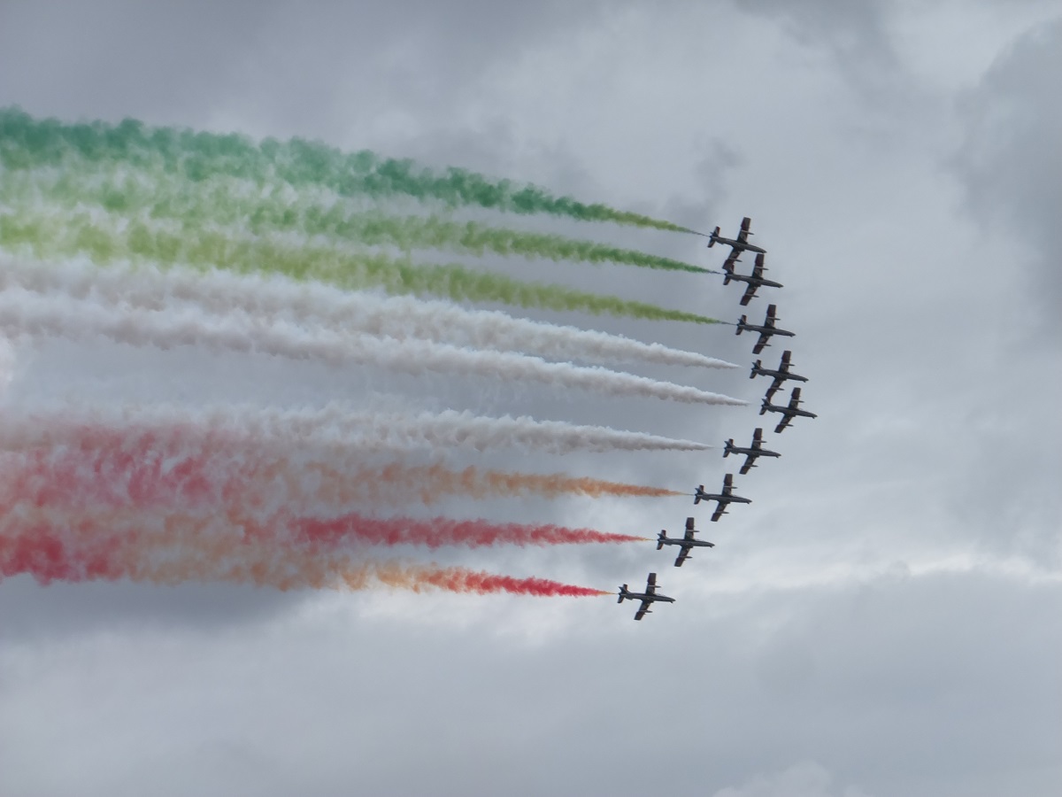 La Frecce Tricolori (nueve cazas Aeromacchi MB-339) dibuja la bandera de Italia sobre el cielo de la base aérea de Torrejón.