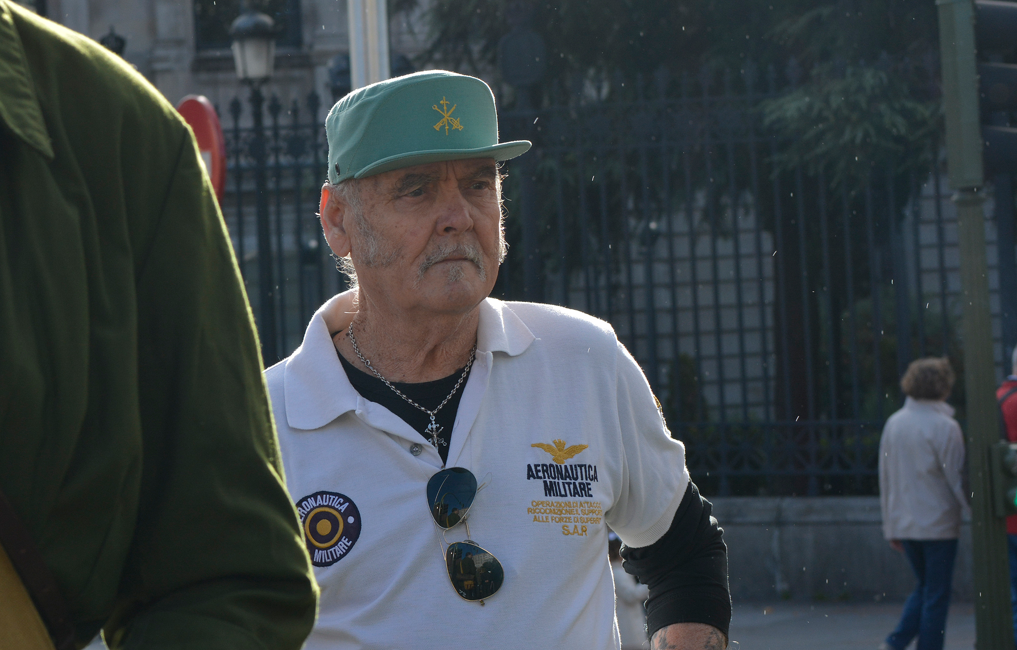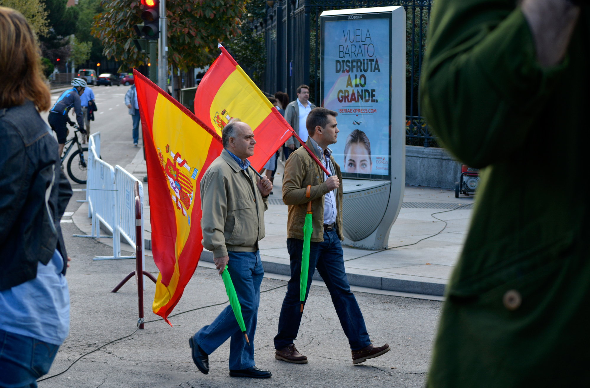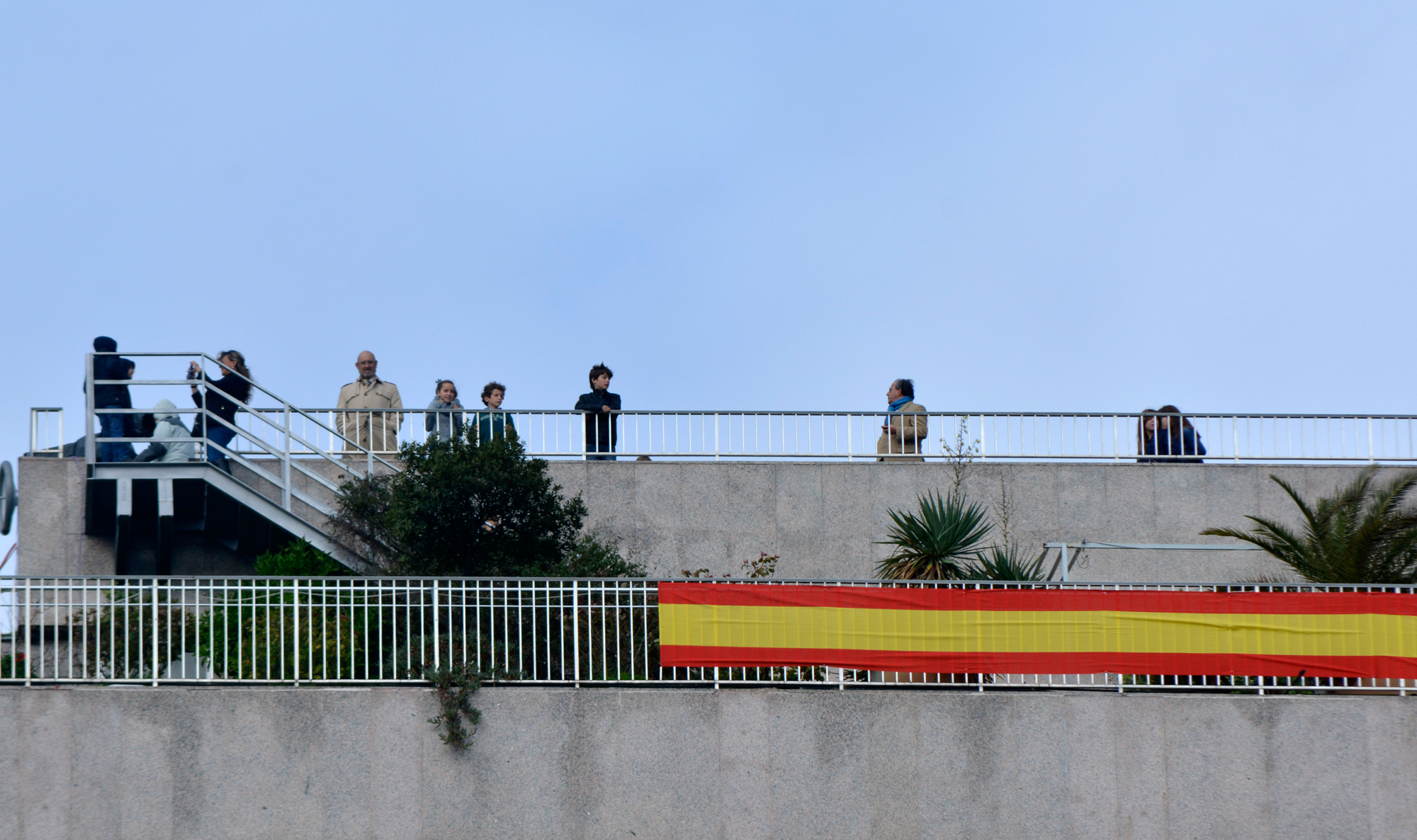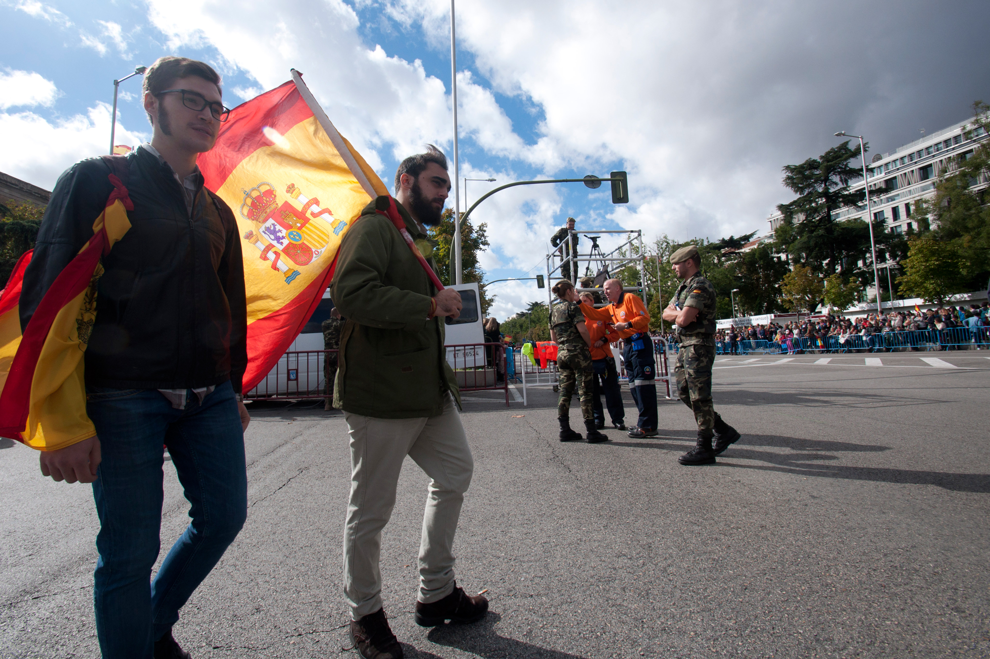 La fría mañana de este 12 de octubre ha obligado a algunos de los asistentes a abrigarse con lo que podían. En este caso con la bandera de España.
